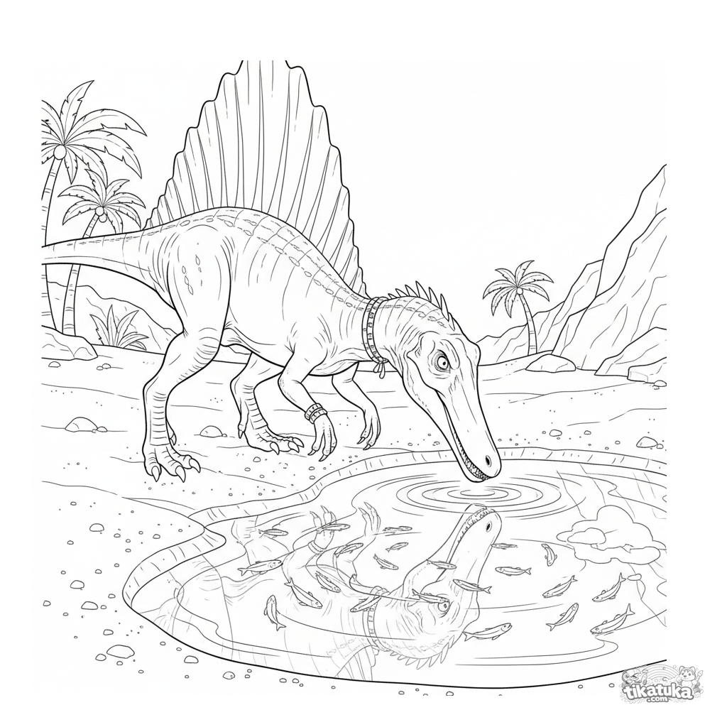 Página complexa para colorir para 10-12 anos: um espinossauro realista caça peixes em uma poça de maré em uma praia antiga.