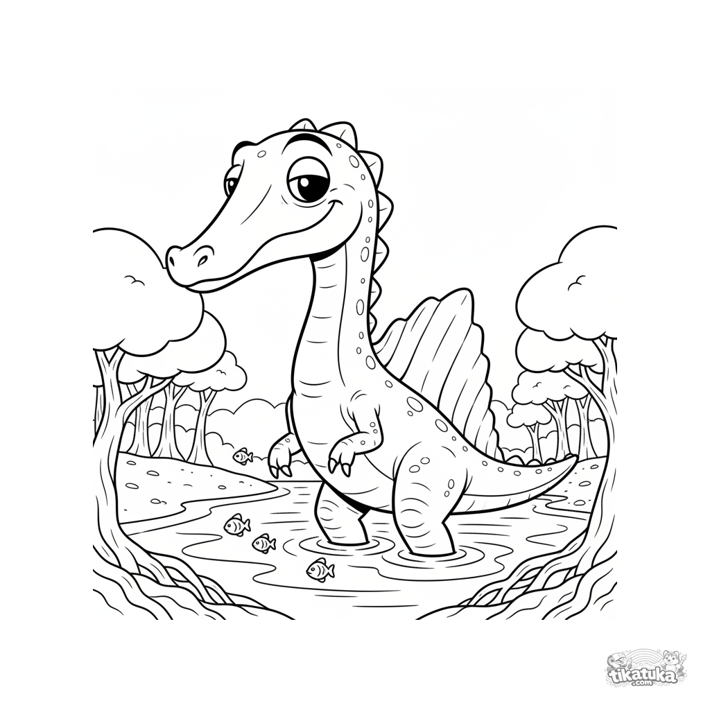 Página para colorir de um espinossauro em pose dinâmica de pesca entre raízes de mangue em um litoral antigo. Para crianças de 7-9 anos. Estilo quadrinhos-aventura.