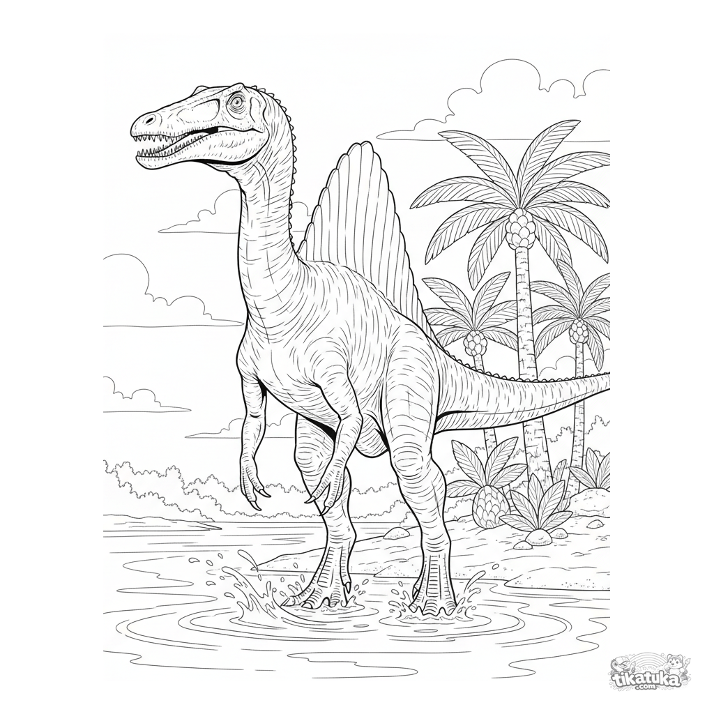 Página para colorir para 10-12 anos: um espinossauro com vela nas costas pesca nas águas rasas de uma lagoa de maré numa praia de oceano antigo. Ilustração realista detalhada.