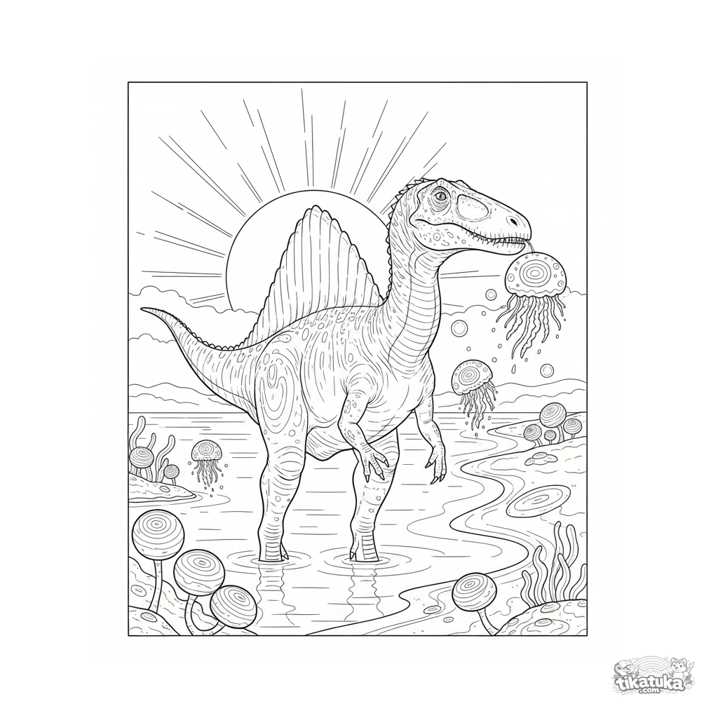 Página para colorir complexa para 10-12 anos: um espinossauro vadeia no crepúsculo, pegando águas-vivas brilhantes nas águas de um oceano antigo. Anatomia detalhada e cena atmosférica.