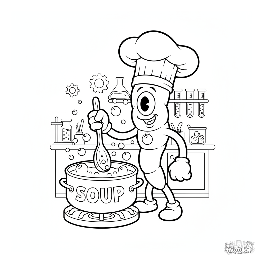 Página para colorir de uma bactéria espiral chef em uma cozinha de placa de petri. Para crianças de 4 a 6 anos. Personagem engraçado em estilo retrô.
