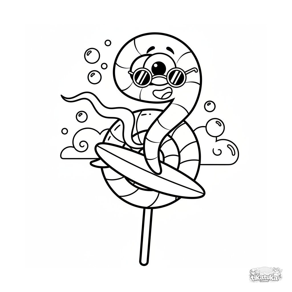 Página para colorir para 7-9 anos: uma bactéria espiral engraçada com óculos de sol surfando na ladeira de um pirulito gigante. Pose dinâmica, tema divertido.