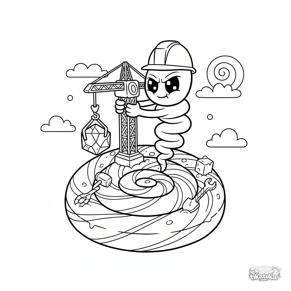 Página para colorir para crianças 4-6: um micróbio espiral engraçado de capacete opera um guindaste em um pirulito gigante. Cena alegre com ferramentas de construção de doces.