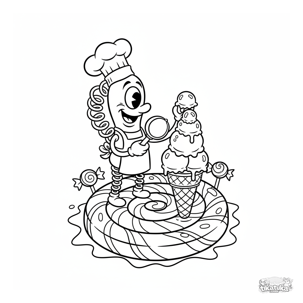 Página para colorir para crianças 4-6: um micróbio espiral engraçado com chapéu de chef fazendo sorvete na superfície de um pirulito gigante. Cena alegre.