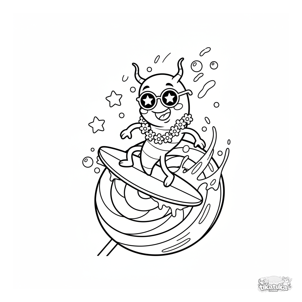 Página para colorir para crianças de 7-9 anos: um micróbio espiral em estilo retrô surfando num pirulito gigante. Cena dinâmica e divertida.