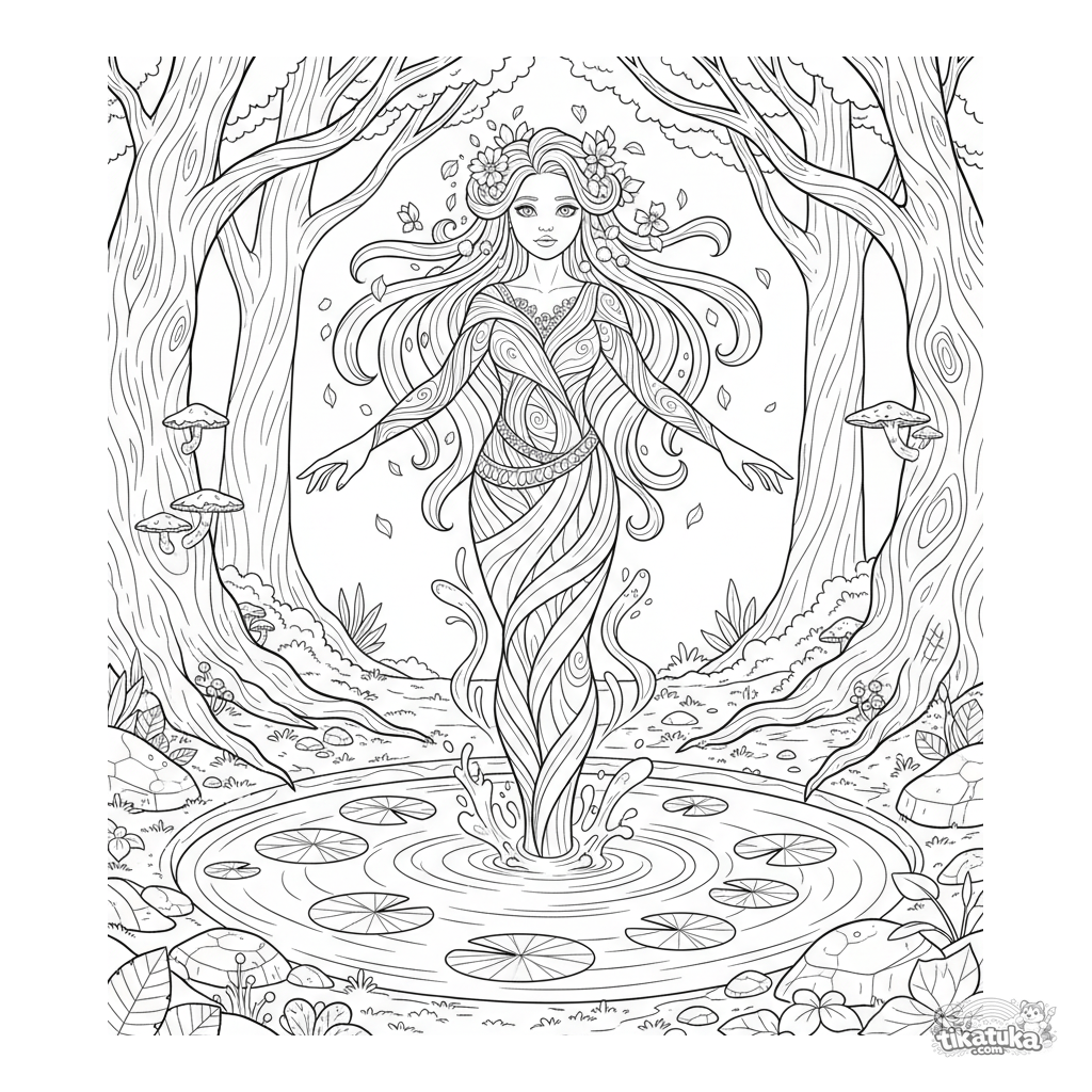 Página para colorir para crianças mais velhas 10-12: um espírito da nascente, tecido de água e videiras, ergue-se de um lago florestal. Estilo Art Nouveau com linhas fluidas.