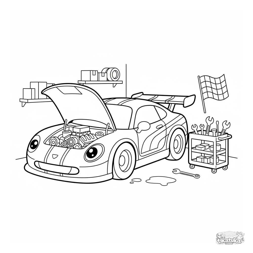 Página para colorir para meninos: um carro de corrida esportivo estacionado na garagem com o capô aberto. Idade 4-6 anos.