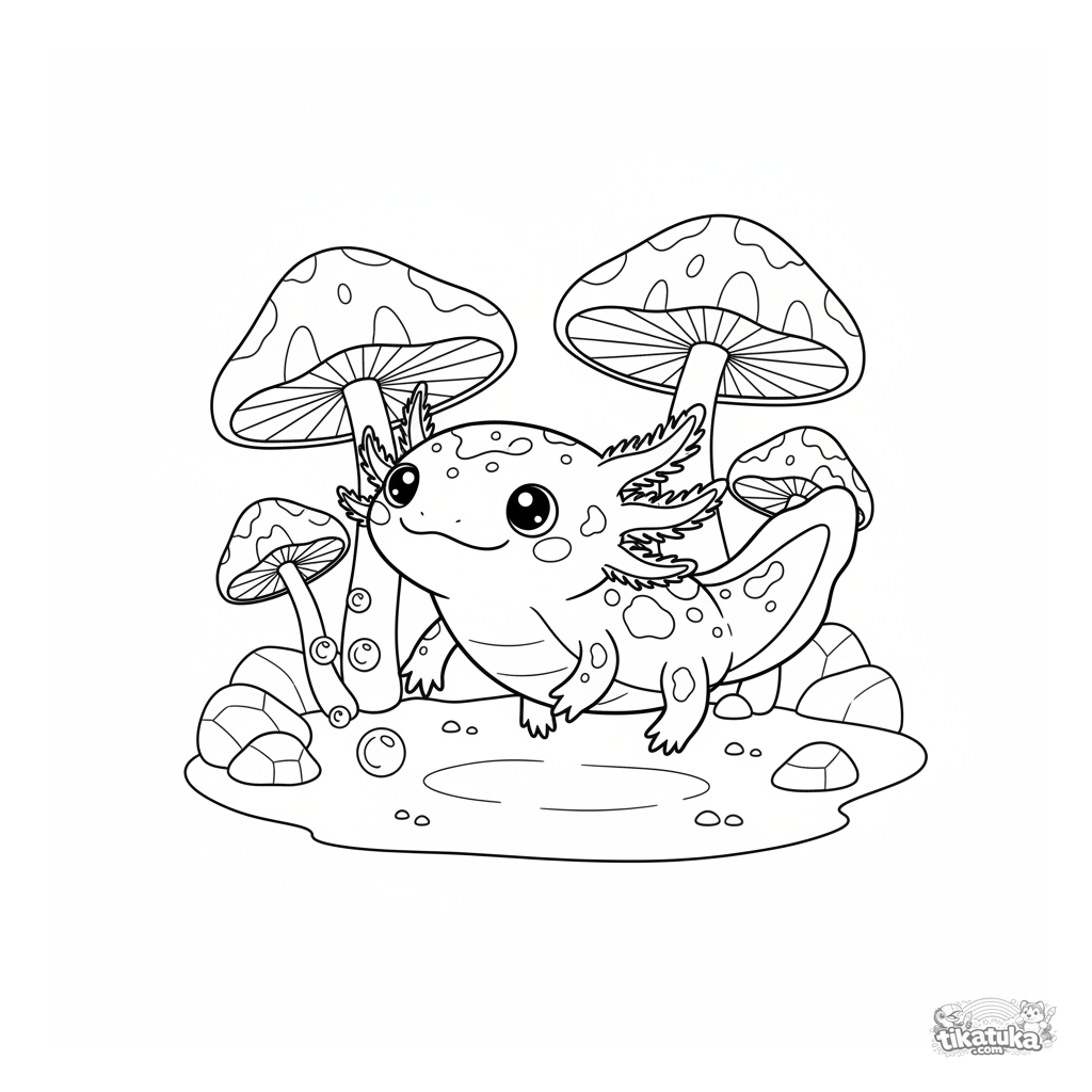 Página para colorir de um axolotle manchado em uma gruta subaquática entre cogumelos brilhantes. Para crianças de 4 a 6 anos. Uma criatura subaquática fofa e calma.
