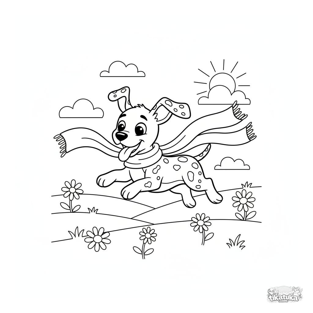 Página para colorir para crianças de 4-6 anos: um feliz filhote de dálmata malhado persegue um lenço esvoaçante por um campo ensolarado. Formas simples e contornos claros.