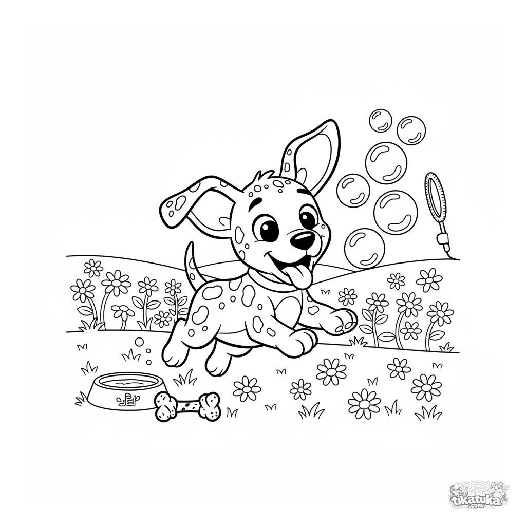 Página para colorir para crianças 3-6: um filhote de dálmata brincalhão persegue bolhas em um campo ensolarado. Detalhes simples para colorir facilmente.