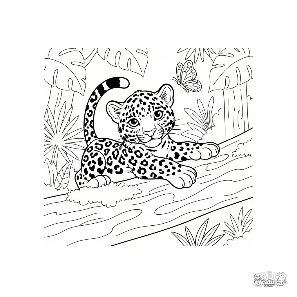 Página para colorir para crianças de 4-6 anos: um filhote de onça-pintada alongando-se em um tronco coberto de musgo em uma clareira da selva.