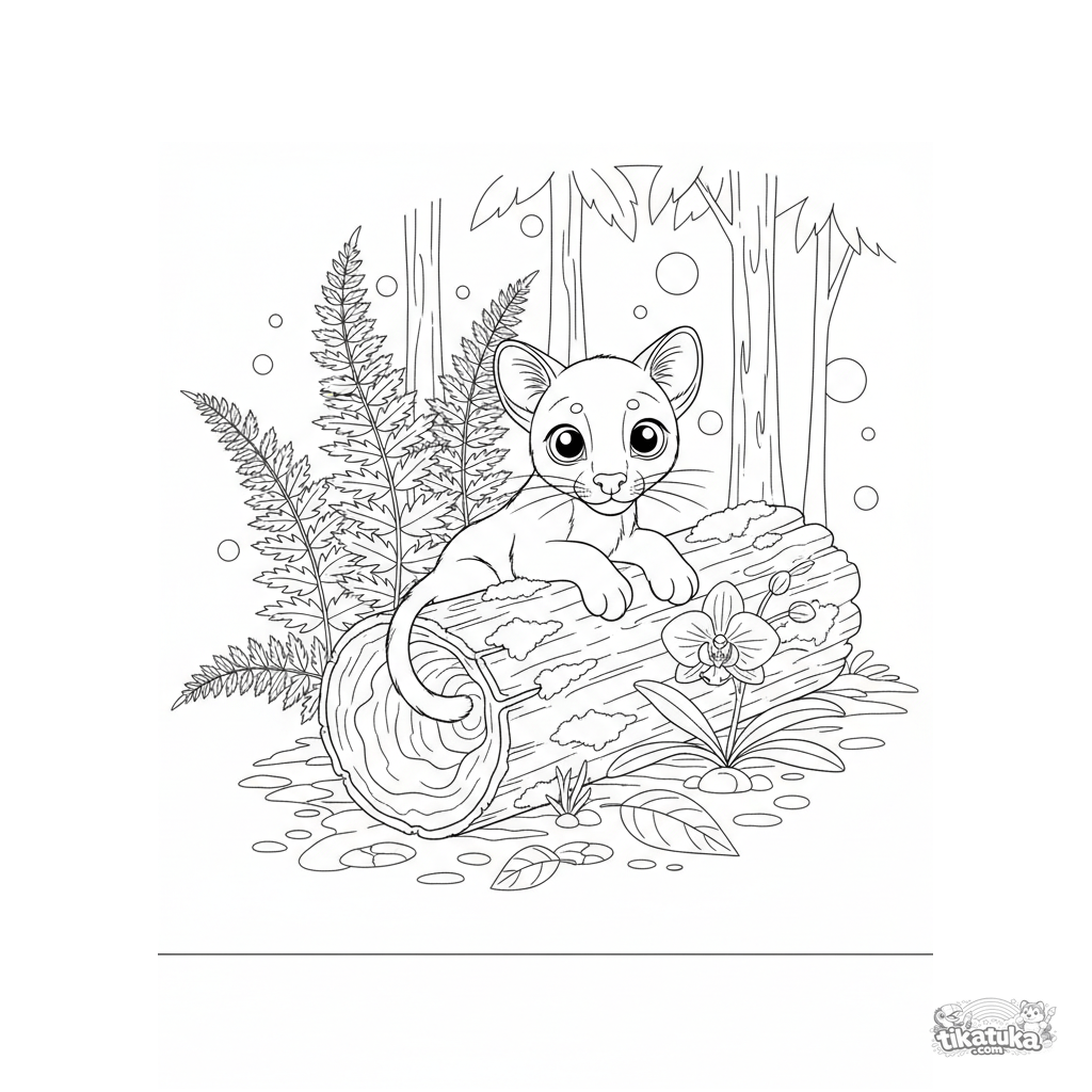 Página para colorir para crianças de 4-6 anos: um filhote raro de jaguarundi espreita de um tronco oco na floresta tropical. Cena simples com amplas margens para colorir.