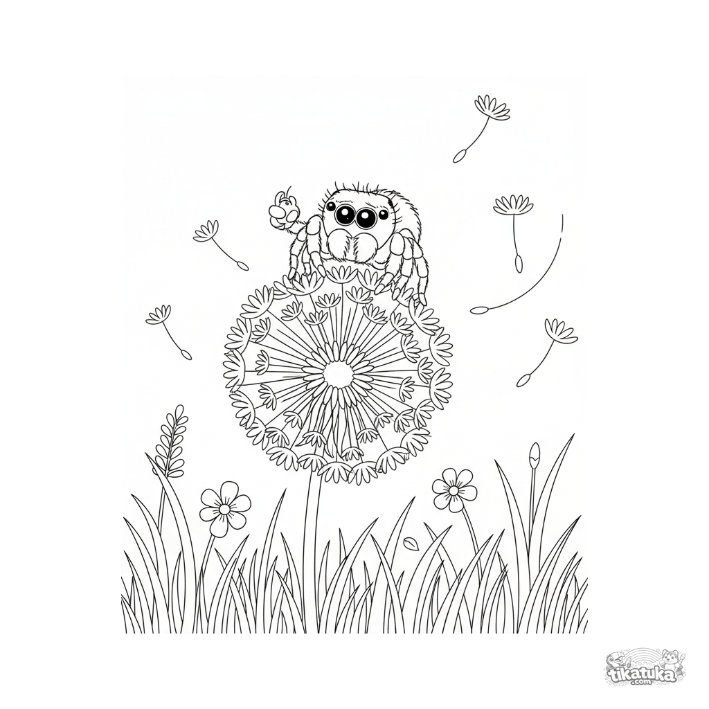 Página para colorir para crianças de 4-6 anos: uma aranha saltadora manchada pousada em um dente-de-leão fofo. Cena natural fofa e detalhada.