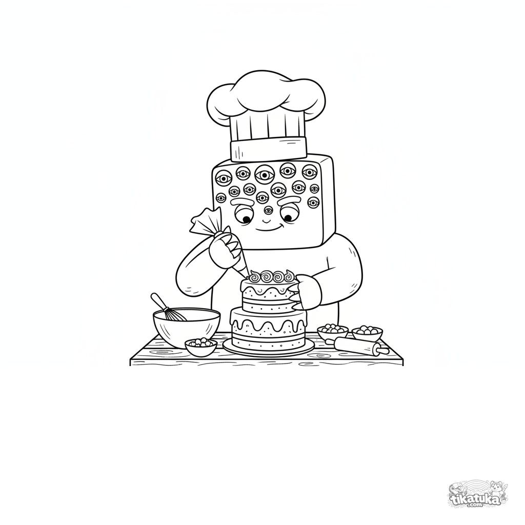 Página detalhada para colorir para crianças 10-12: um monstro quadrado chef decorando um bolo de camadas em um piquenique. Muitos elementos para colorir.