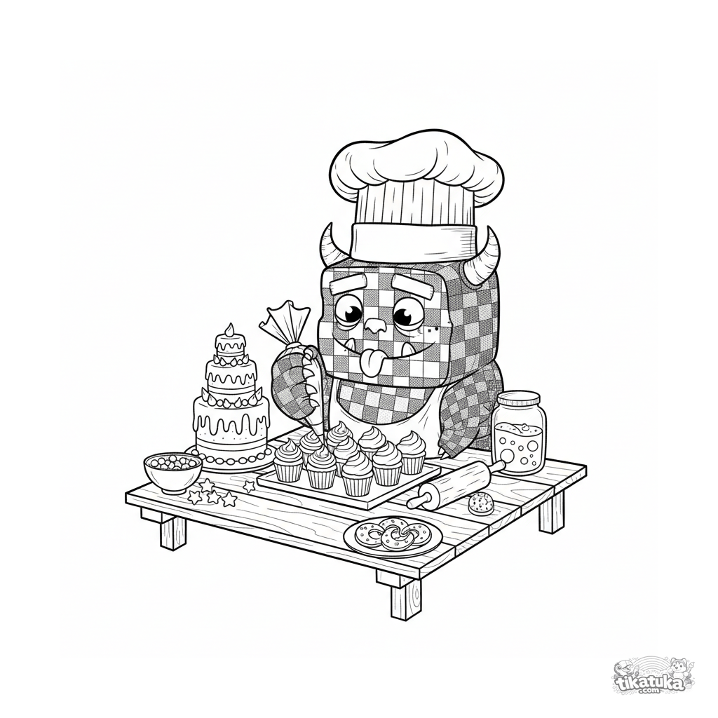 Página para colorir detalhada para 10-12 anos: um monstro quadrado chef decorando cupcakes em um piquenique com doces monstruosos. Contornos limpos, muitos elementos.