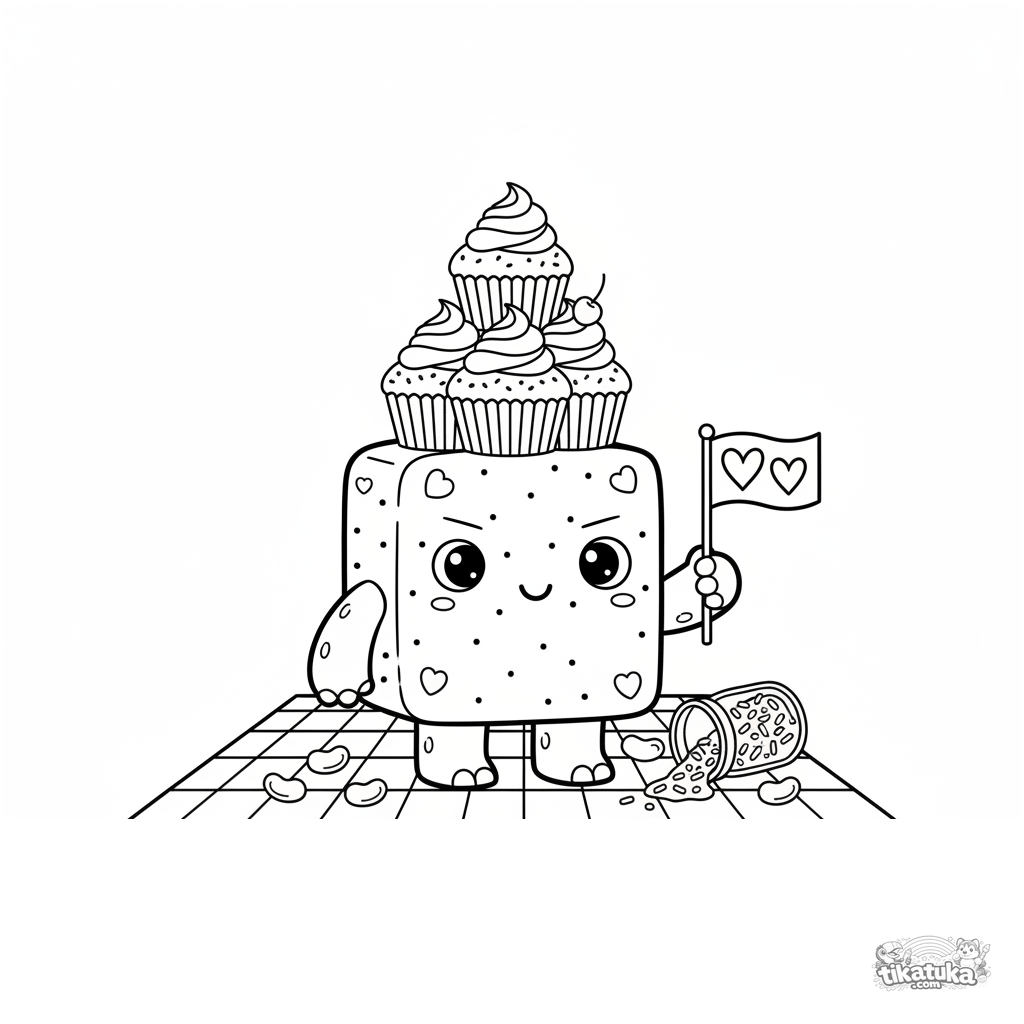 Página para colorir para crianças 4-6: um monstro quadrado com muitos olhos guardando uma torre de cupcakes em um piquenique. Cena divertida.