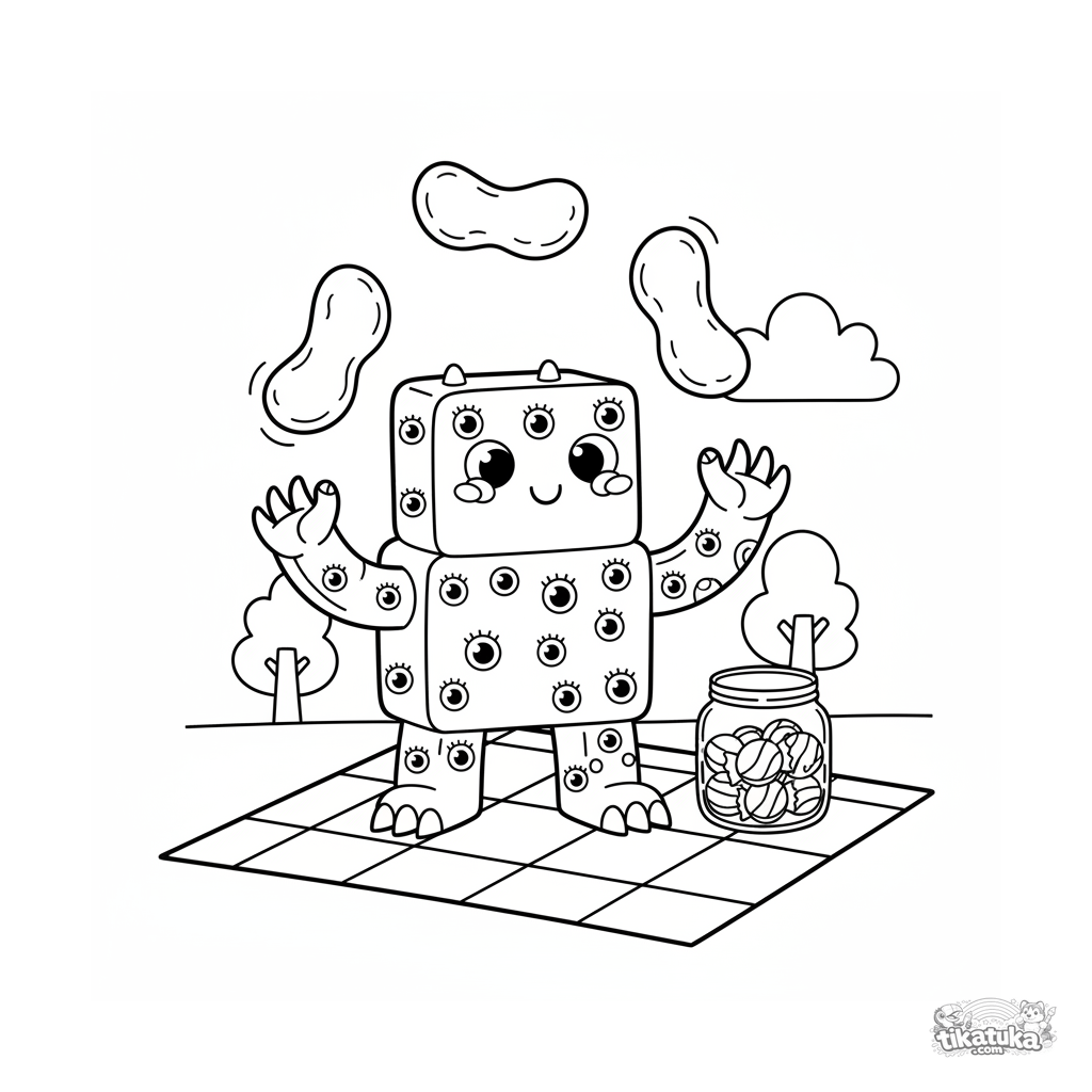 Página para colorir para crianças de 4-6 anos: um monstro quadrado com muitos olhos malabariza jujubas gigantes em um piquenique. Cena divertida e simples.