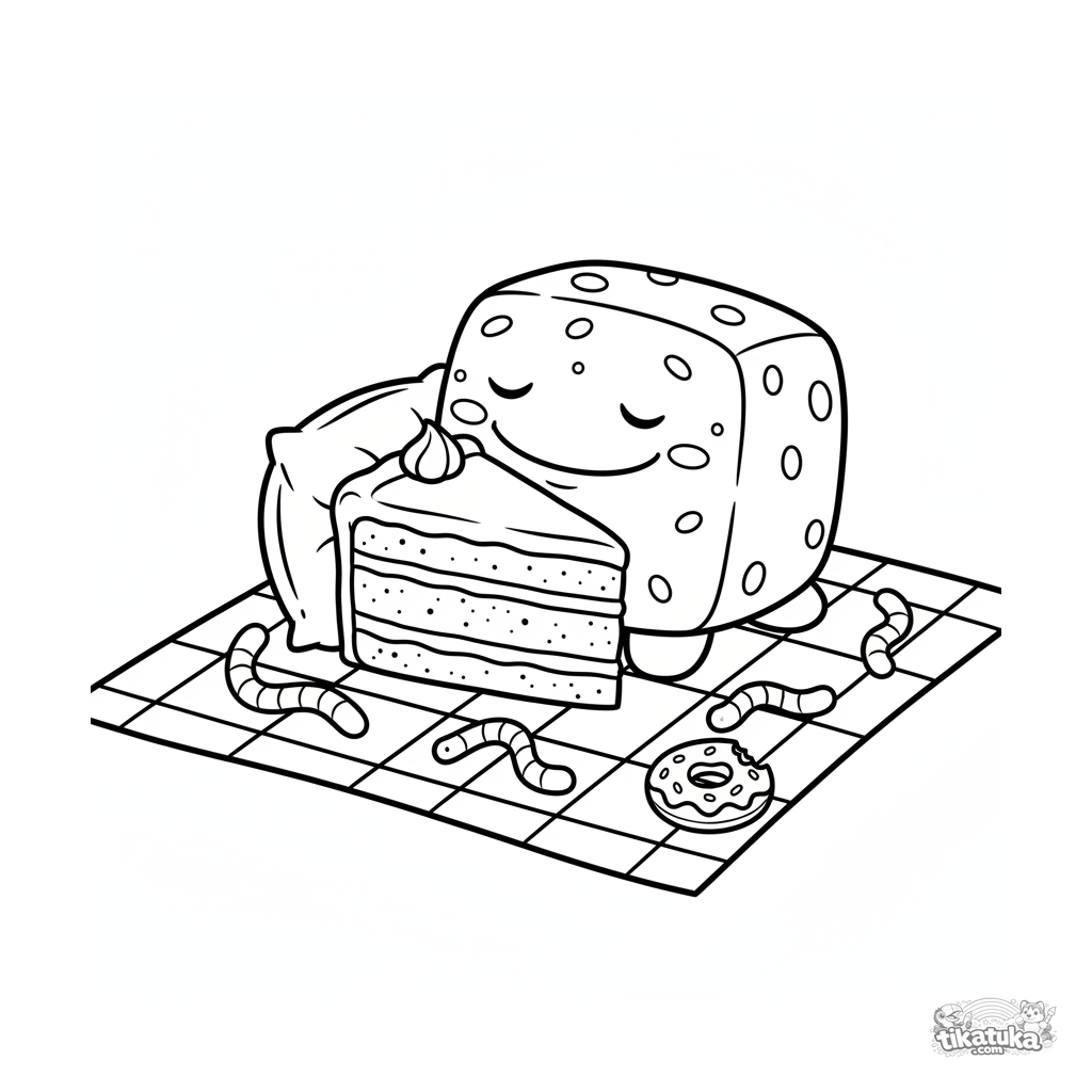 Página simples para colorir para bebês: um monstro quadrado dormindo em um piquenique, usando um bolo como travesseiro. Formas grandes, poucos detalhes.