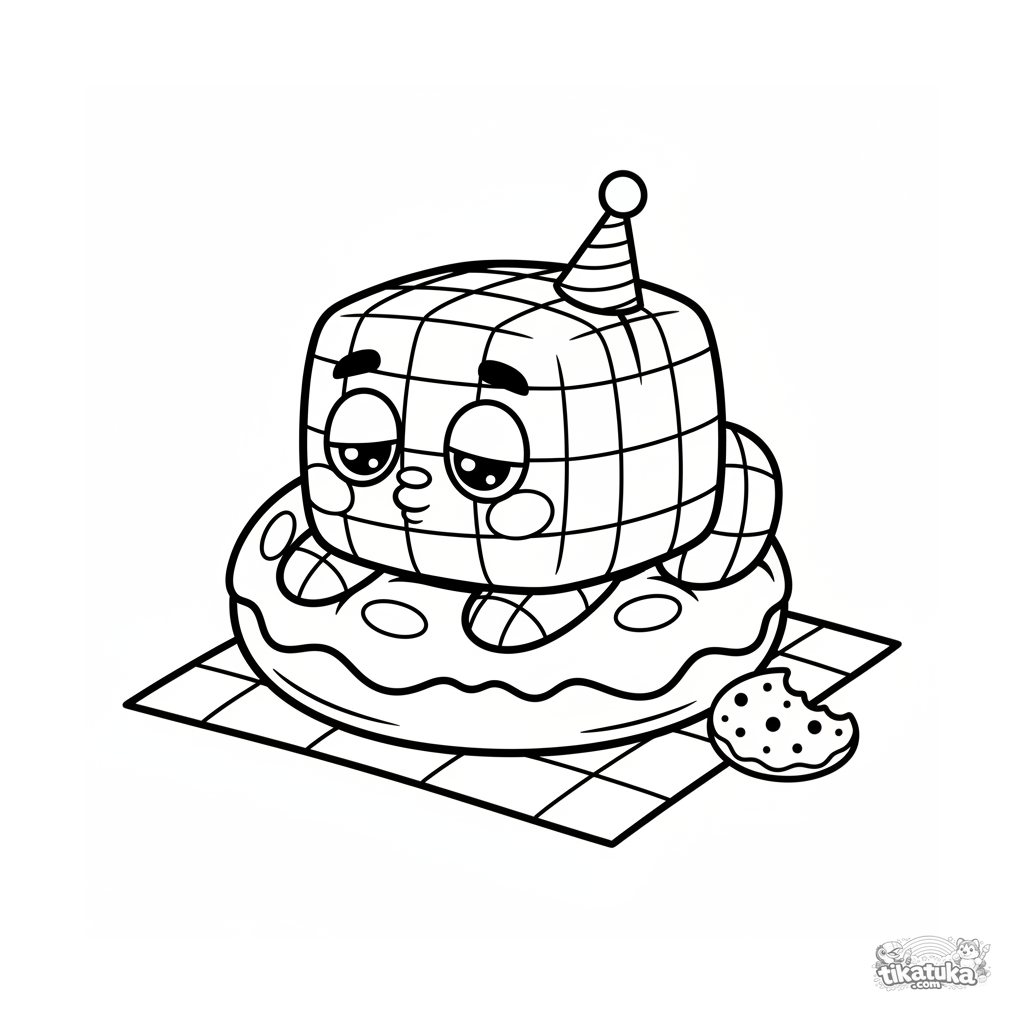 Página simples para colorir para bebês: um monstro quadrado dormindo em um donut em um piquenique. Formas grandes, poucos detalhes. Para 2-3 anos.