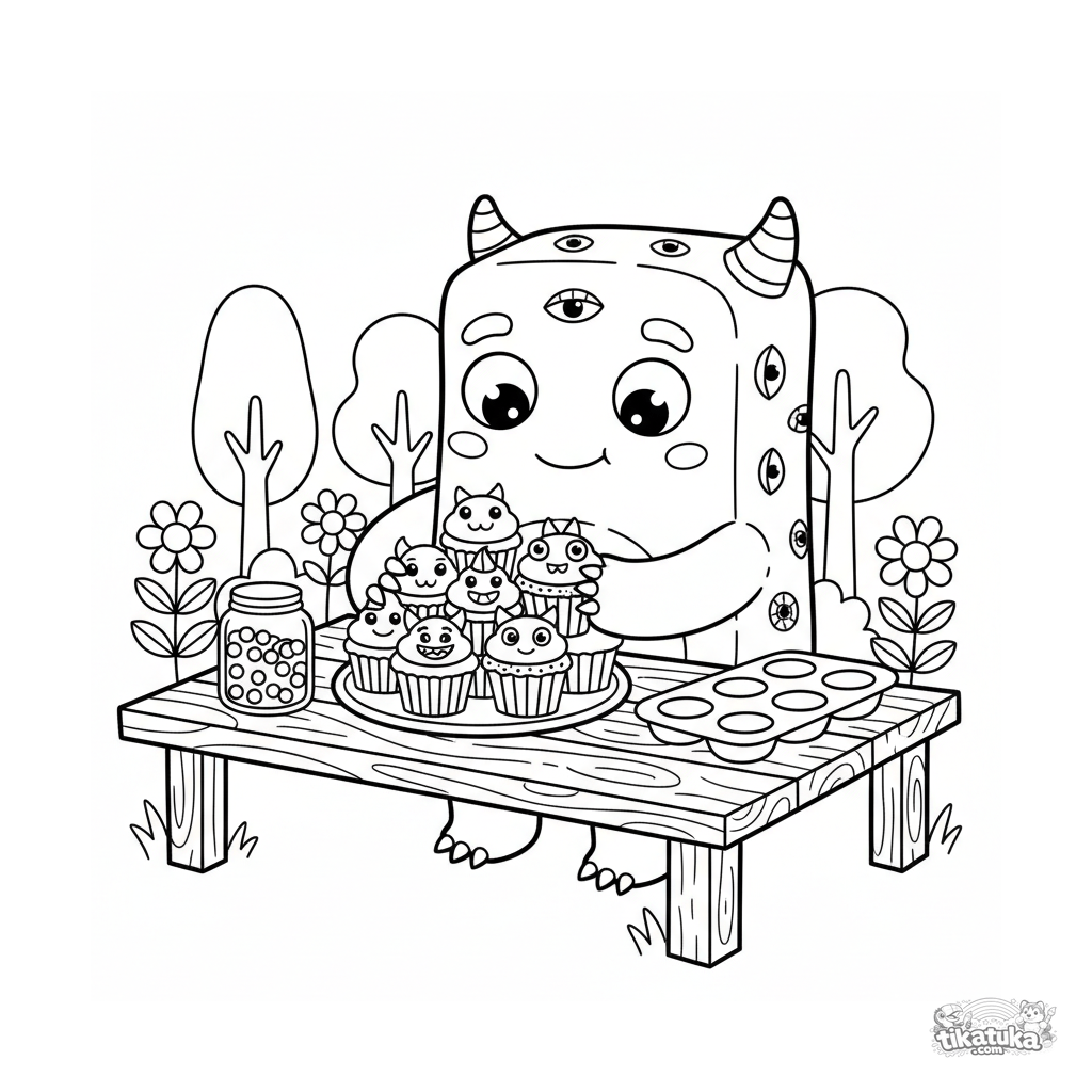 Página para colorir para crianças 4-6: um monstro quadrado com muitos olhos de pontos organizando cupcakes em um piquenique. Formas simples.