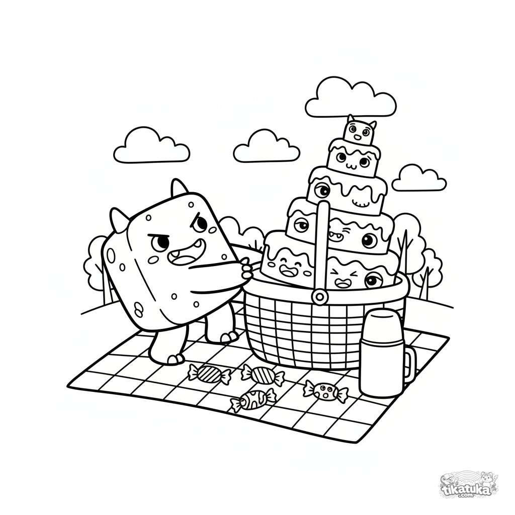 Página para colorir para crianças de 4-6 anos: um monstro quadrado com muitos olhos desempacotando uma cesta de piquenique com um bolo.