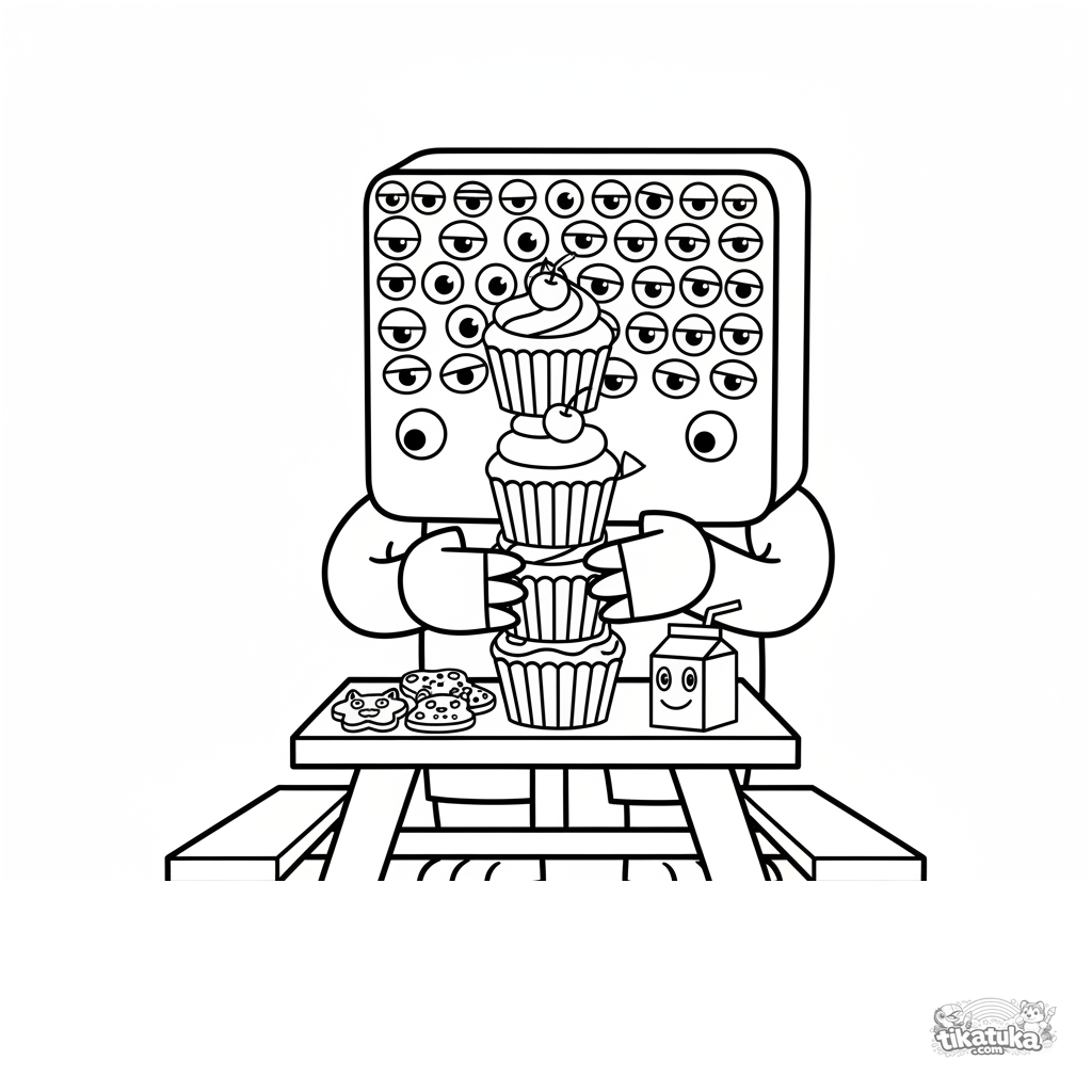 Página simples para colorir para bebês: um monstro quadrado construindo uma torre de cupcakes em um piquenique. Formas grandes, poucos detalhes.