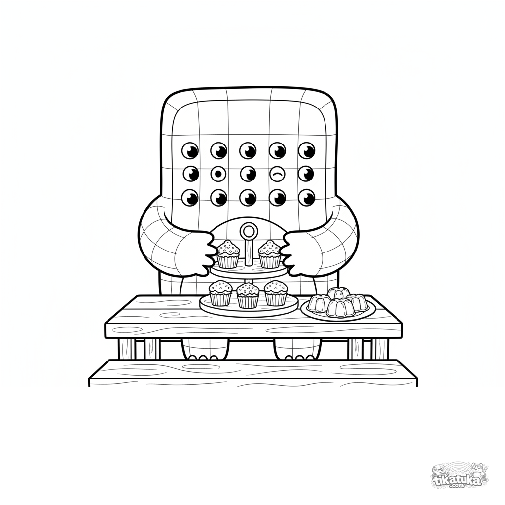 Página para colorir de um monstro quadrado com muitos olhos arrumando bolinhos em um piquenique. Detalhe intrincado para crianças mais velhas de 10-12 anos.