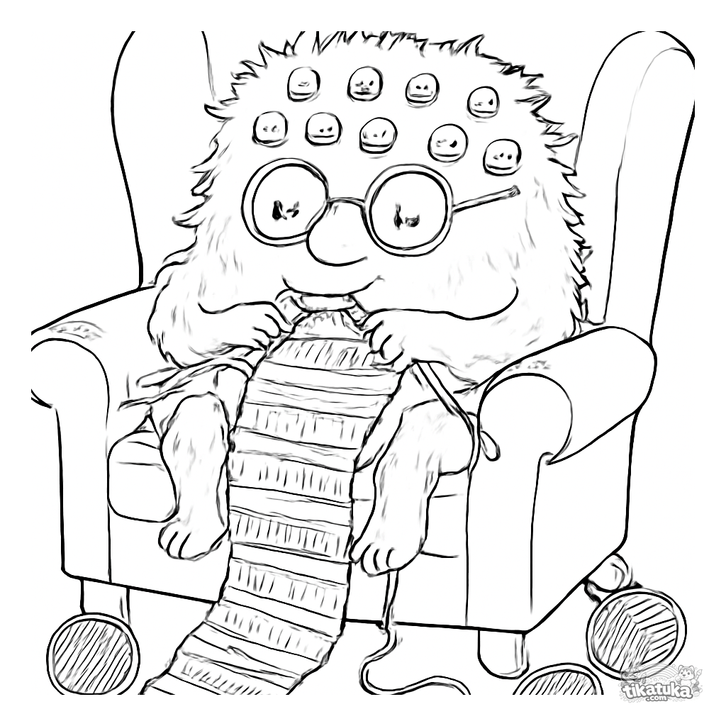 Página para colorir de um monstro quadrado com muitos olhos tricotando um cachecol em uma poltrona. Para crianças de 6 a 9 anos.