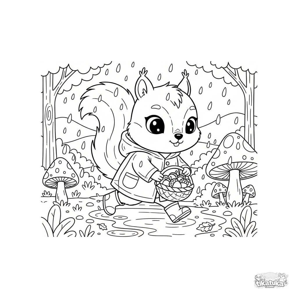 Página para colorir para crianças de 4-6 anos: um esquilo com capa de chuva e botas coleta bolotas em uma trilha florestal sob a chuva outonal. Detalhe moderado.