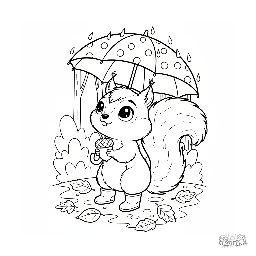 Página para colorir para crianças (4-6 anos): um esquilo fofo com botinhas sob um guarda-chuva xadrez segurando uma bolota na chuva de outono na floresta. Detalhes equilibrados.