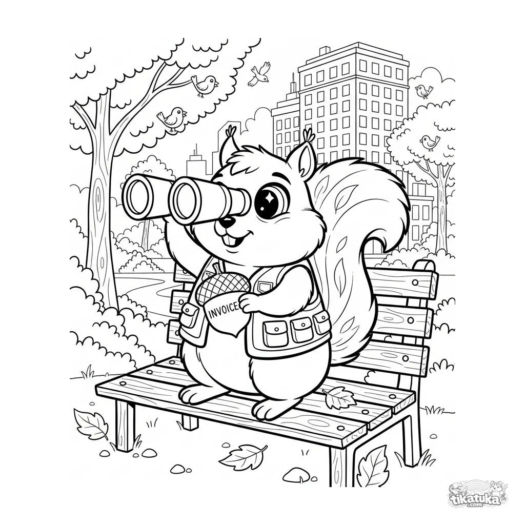 Página para colorir para crianças de 10-12 anos: um esquilo determinado com colete e binóculos em um banco de parque, procurando seu dia do pagamento. Cena engraçada e detalhada.