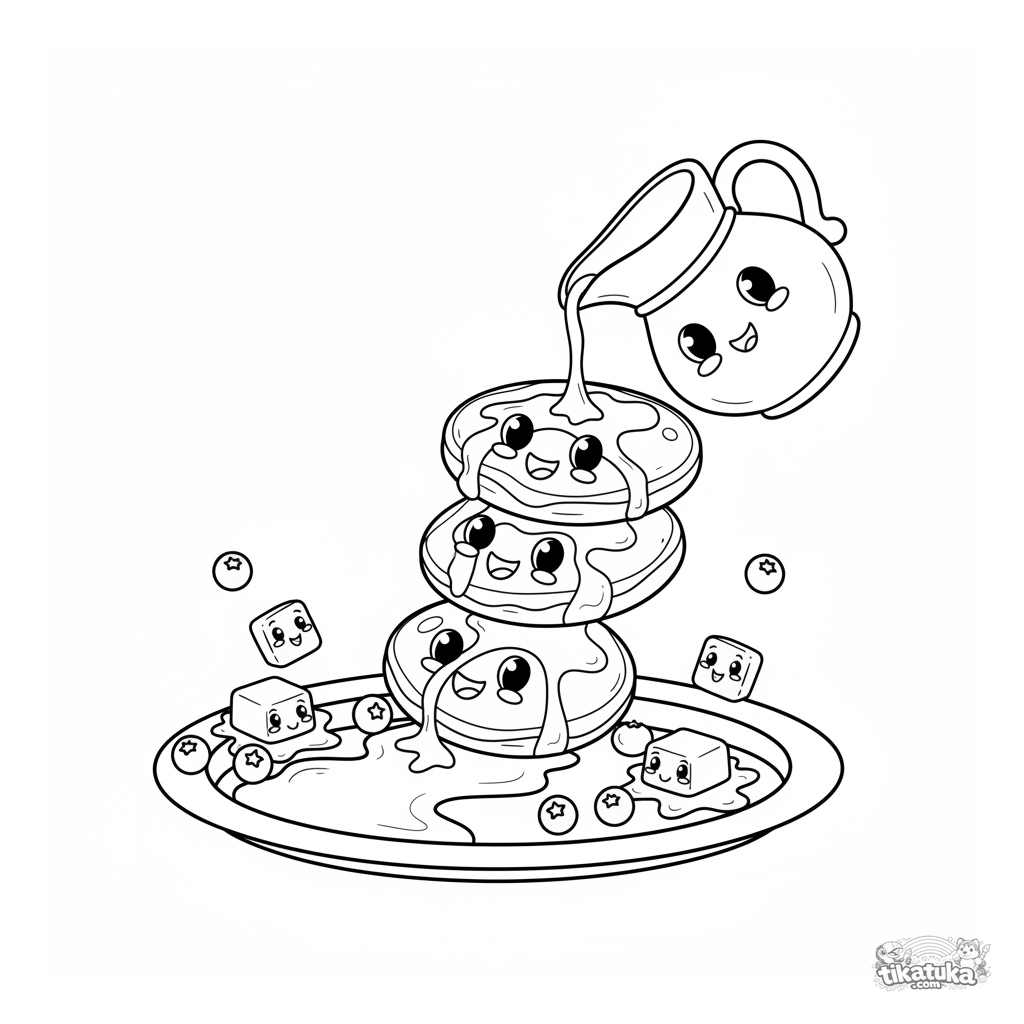 Página para colorir simples para crianças de 2 a 3 anos. Uma pilha feliz de panquecas com rostos desce num escorregador de xarope em um prato com frutas e manteiga.