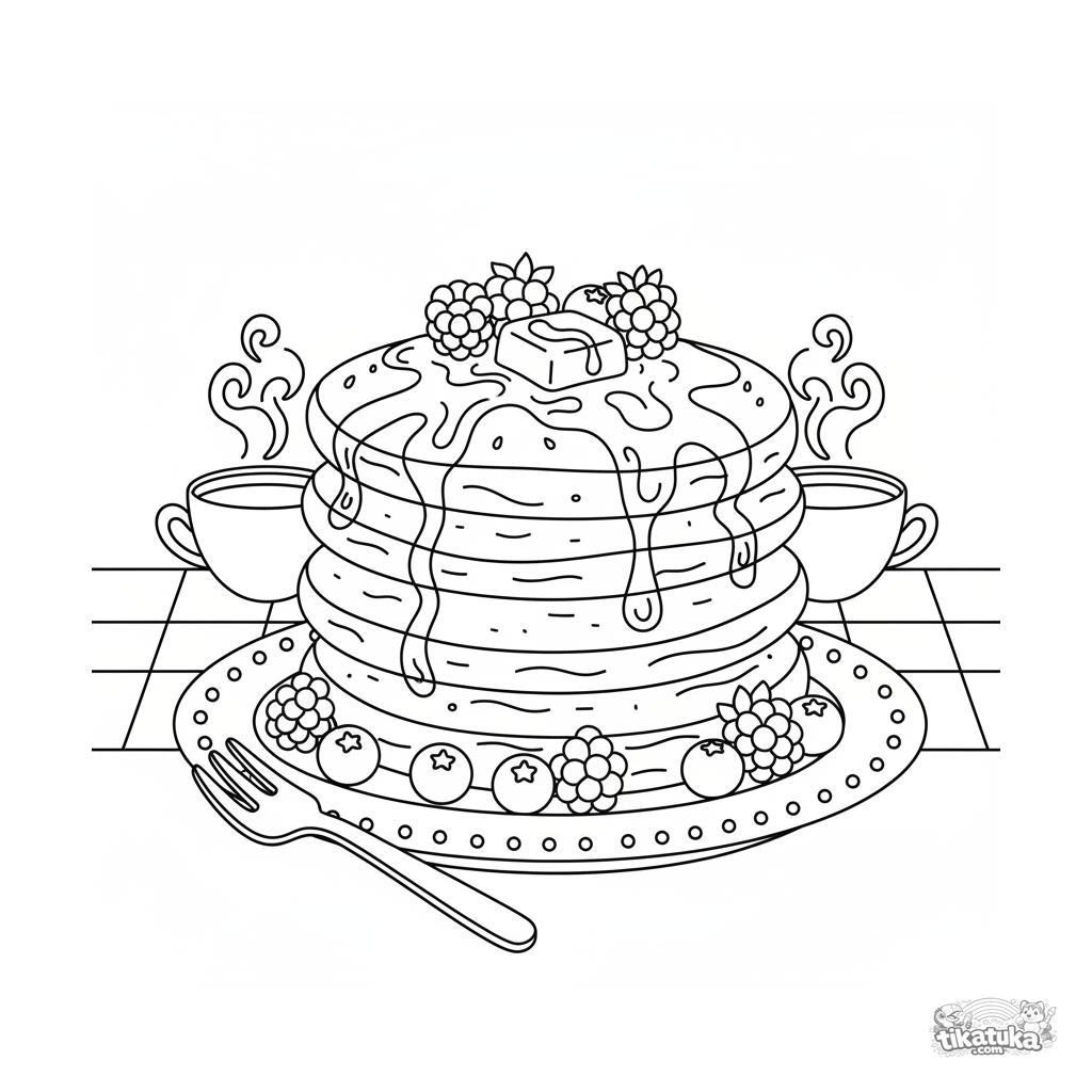 Página para colorir de uma pilha de panquecas deliciosas. Para crianças de 4 a 6 anos. As panquecas estão regadas com xarope, cobertas com frutas vermelhas e uma noz de manteiga, com um garfo ao lado.