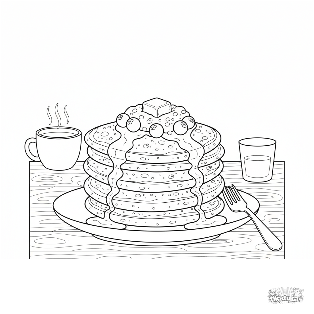 Página para colorir simples para crianças pequenas 2-3: uma grande pilha de panquecas saborosas com frutas vermelhas. Formas grandes e claras, pouco detalhe, ideal para primeiras colorações.