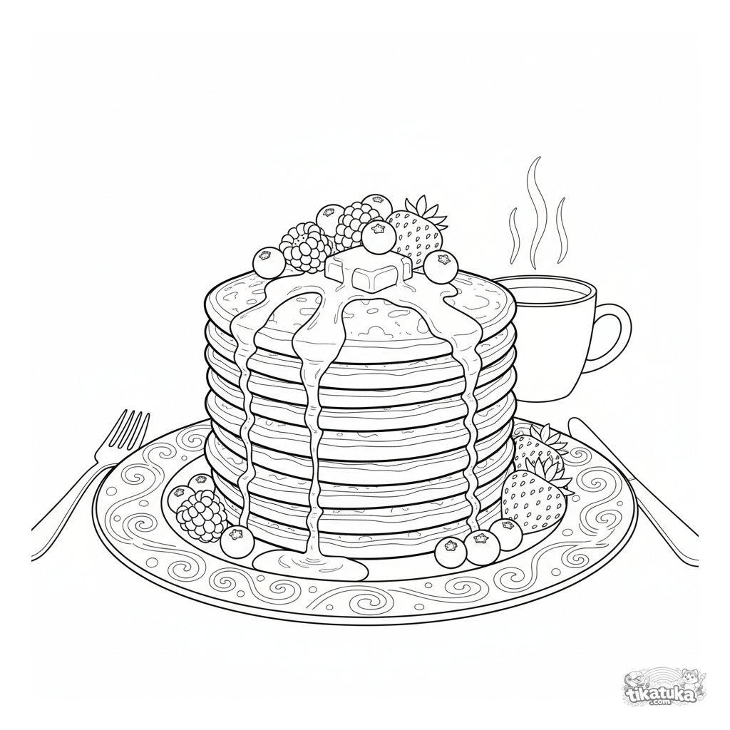 Página para colorir de comida deliciosa para crianças de 4 a 6 anos. Uma pilha de panquecas com calda, frutas vermelhas e manteiga.