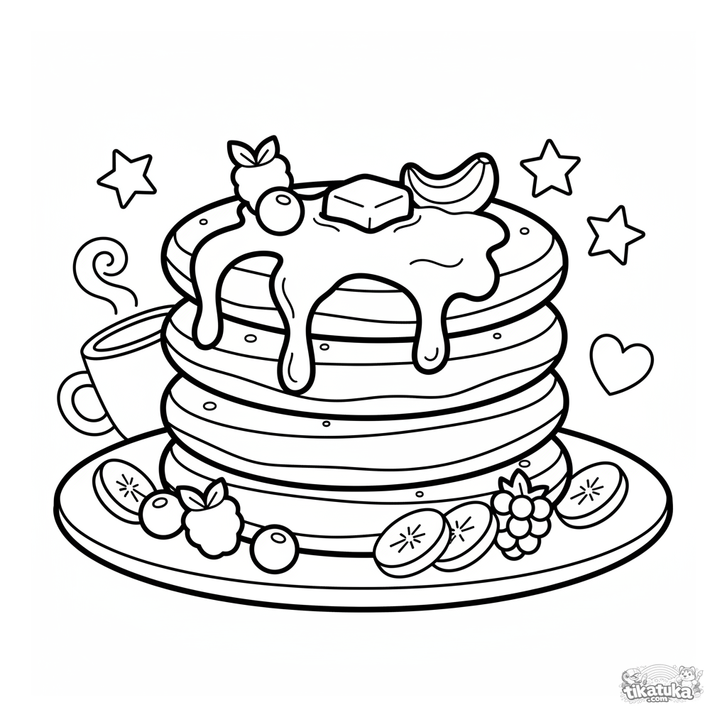 Página para colorir para crianças de 4 a 6 anos: uma pilha de panquecas saborosas com frutas vermelhas e cobertura. Cena brilhante e simples, ideal para aprender sobre comida.