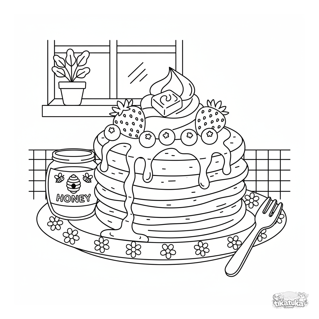 Página para colorir para crianças de 4 a 6 anos: uma deliciosa pilha de panquecas com chantilly, frutas vermelhas e xarope. Uma cena de desenho animado divertida.