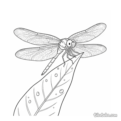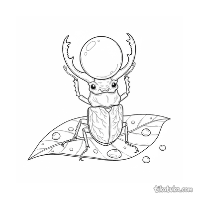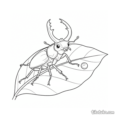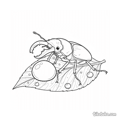 Página para colorir para crianças 4-6: um poderoso besouro veado exibe suas grandes mandíbulas em uma folha com orvalho. Personagem de inseto marcante.