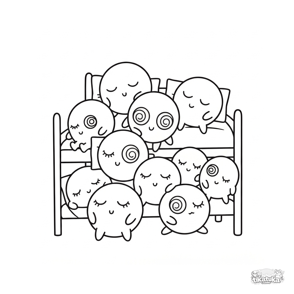 Página para colorir para crianças. Micróbios redondos fofos dormindo em beliches coloridos com olhos fechados. Educativo. Download grátis.