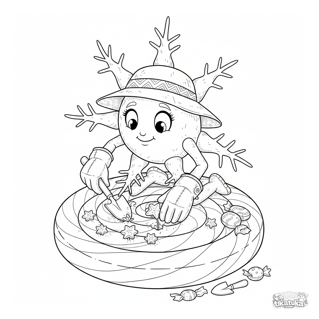 Página detalhada para colorir para crianças maiores de 10-12 anos: um microbio jardineiro em forma de estrela com luvas plantando brotos de doce num pirulito. Alto nível de detalhe.