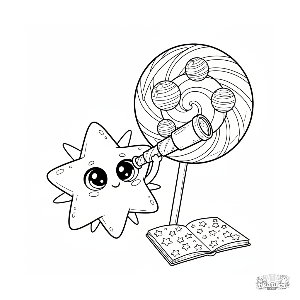 Página fofa no estilo kawaii para crianças 4-6: um micróbio estrela astrônomo olha por um telescópio para planetas de doce em um pirulito. Olhos de coração.