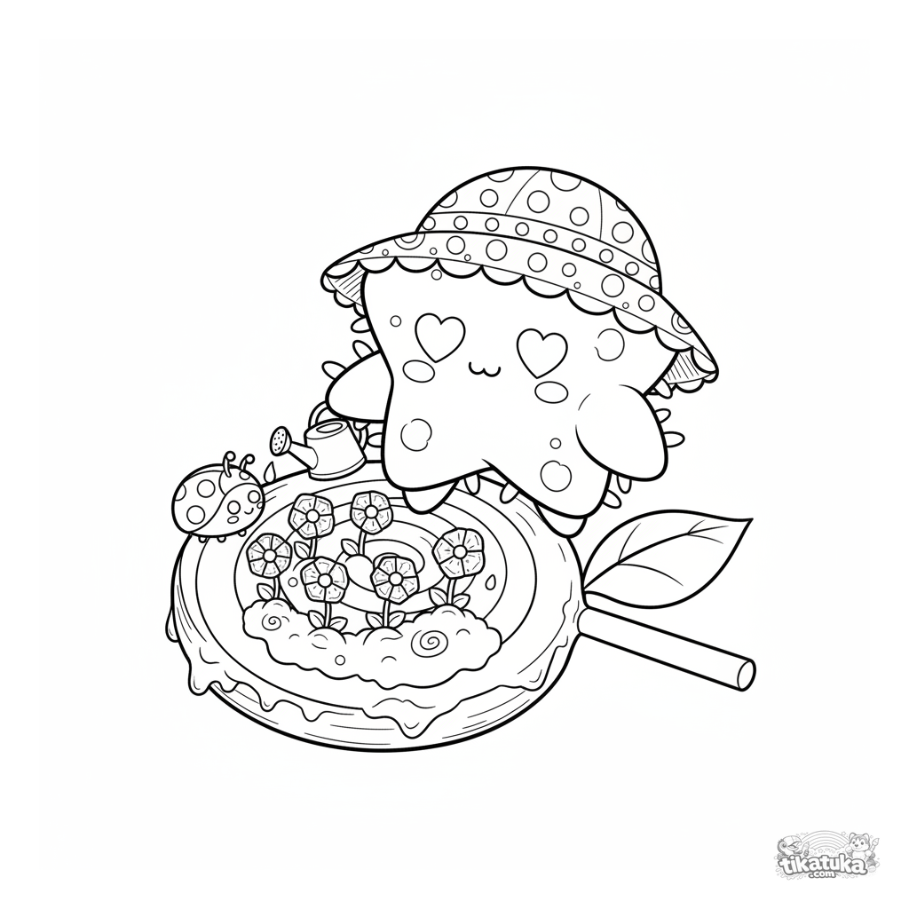 Página para colorir detalhada no estilo kawaii para crianças de 10 a 12 anos: um micróbio estrela jardineiro rega flores de doce em um pirulito. Muitos elementos pequenos para colorir.