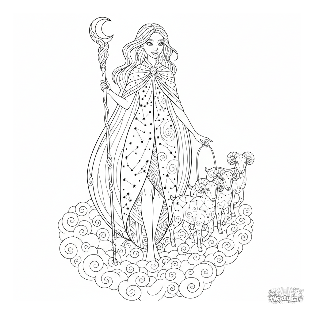 Página para colorir para crianças mais velhas 10-12: um pastor estelar com uma capa de céu noturno guia um rebanho de carneiros constelação brilhantes através de uma trilha de nuvens nebulosas.