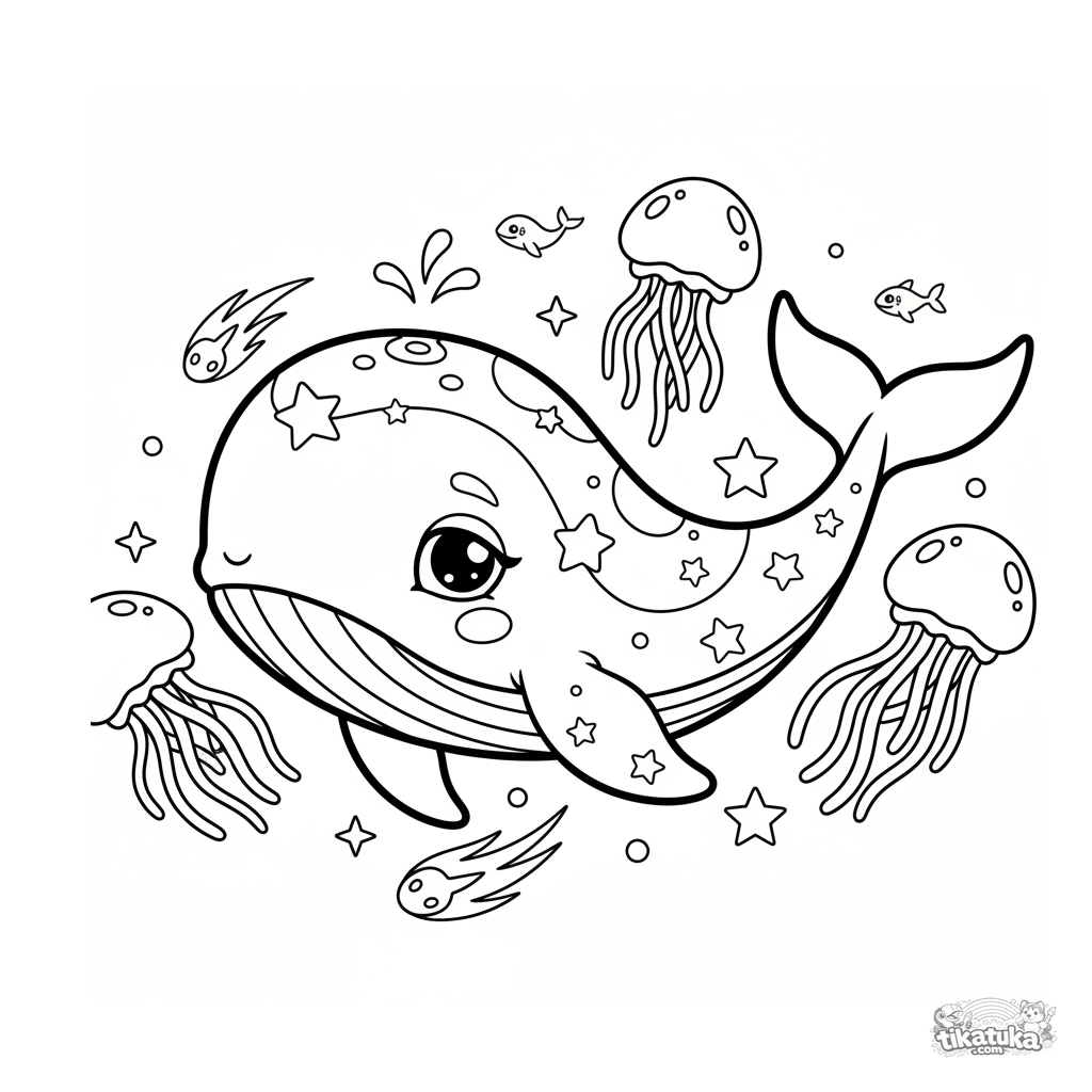 Página simples para colorir para crianças pequenas 2-3: um filhote de baleia estelar nada através de uma nebulosa cósmica colorida. Formas grandes e fluidas, poucos detalhes.