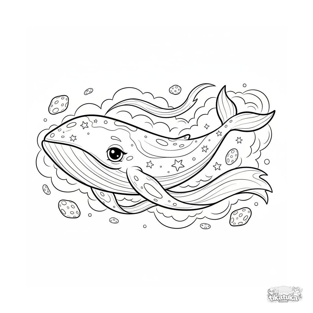 Página para colorir para 7-9 anos: uma baleia estelar gigante nada através de uma nebulosa colorida. Cena em estilo aquarela-esboço para colorir criativamente.