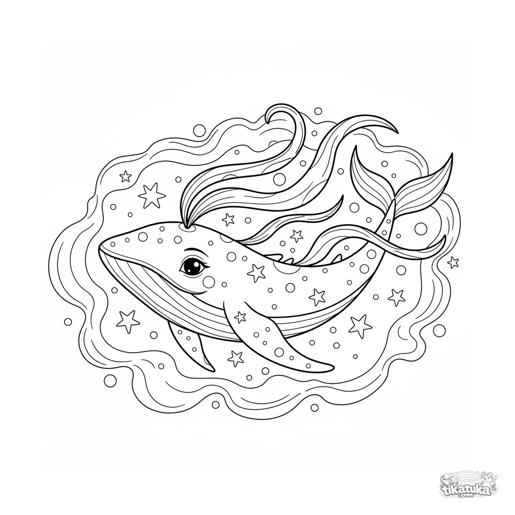 Página para colorir para pré-adolescentes 7-9: uma majestosa baleia estelar, com corpo padronizado como um céu noturno, nada através de uma nebulosa cósmica colorida. Cena de fantasia fascinante.
