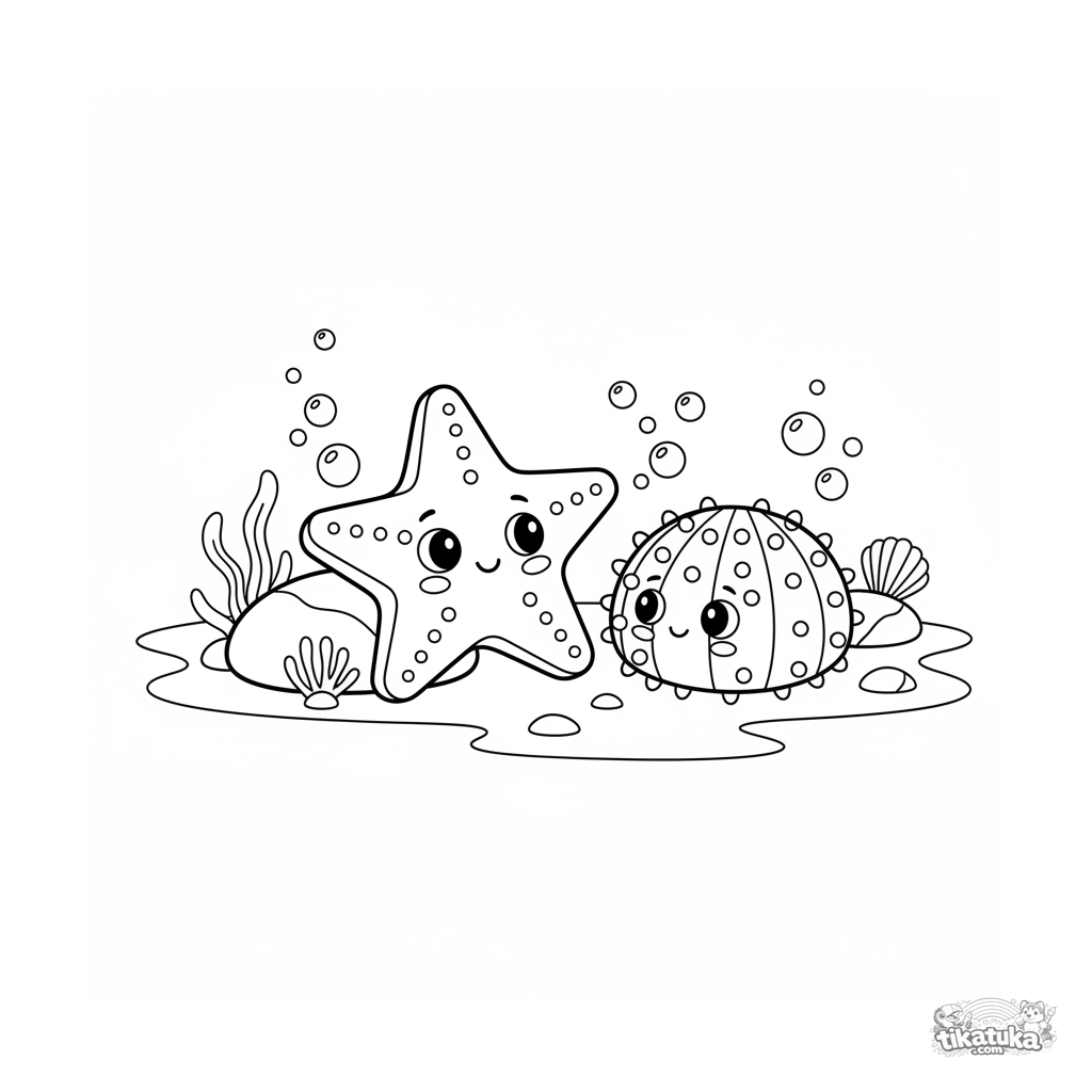 Página para colorir para crianças de 4-6 anos: uma estrela-do-mar amigável e um ouriço-do-mar espinhoso conversando em uma rocha em uma poça de maré ensolarada.