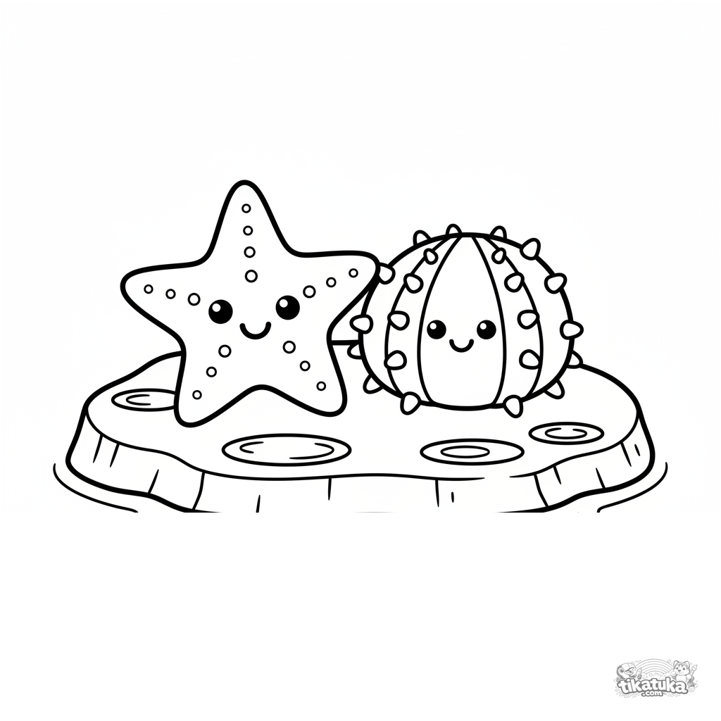 Página simples para colorir para crianças pequenas: uma estrela-do-mar e um ouriço numa pedra numa poça de maré ensolarada. Para 2-3 anos. Formas geométricas como brinquedos de madeira.