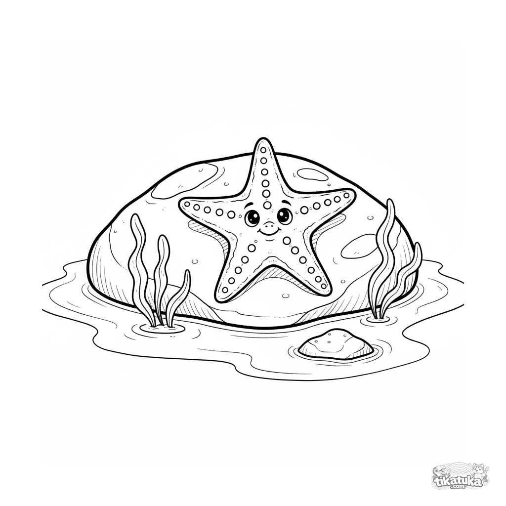 Página para colorir de uma estrela-do-mar descansando em uma rocha em uma poça de maré ensolarada em águas rasas. Para crianças de 7 a 9 anos.