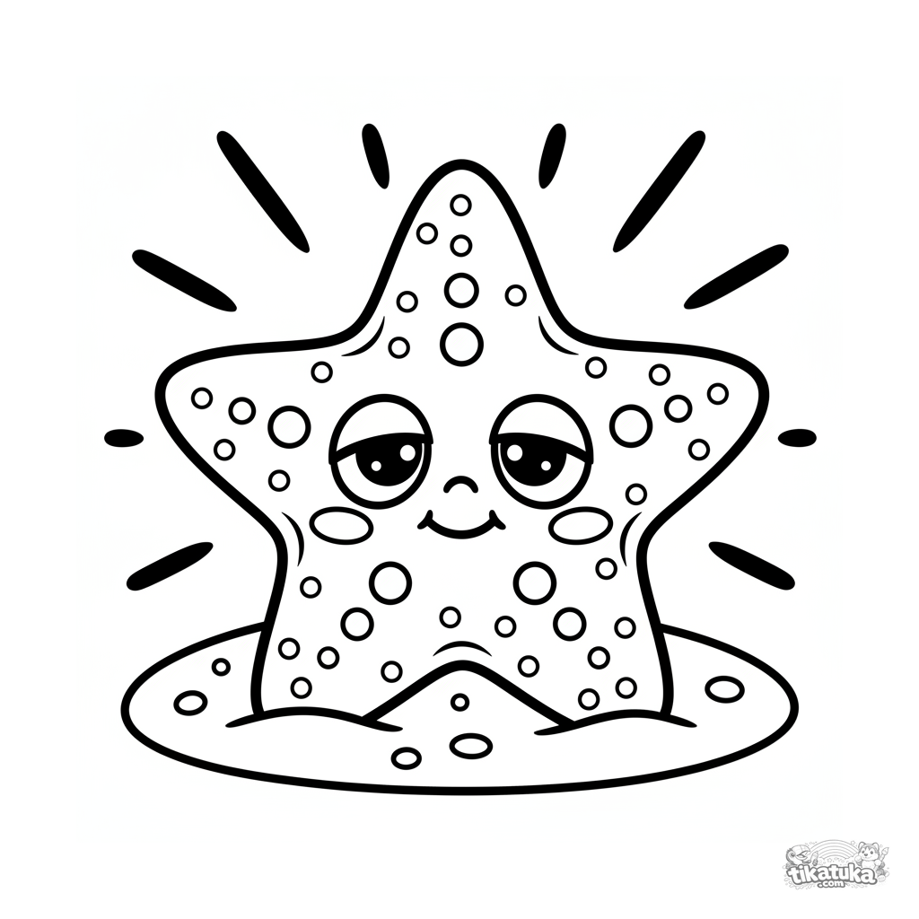 Página para colorir simples e fofa de uma estrela-do-mar descansando na areia quente ao sol. Formas muito simples para bebês de 2-3 anos.